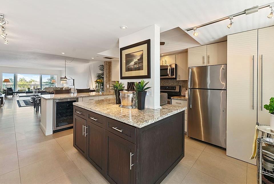 Pompano Beach Intracoastal front 1600 sq ft. condo Welcome home, the minute you walk into this condo you'll want to make it yours. You are greeted with an open concept entry, and a tasteful, designer renovated decor. It includes an extended kitchen, oversized island, granite countertops & backsplash, stainless appliances, wine cooler and built in W/D. Lots of cabinets and storage. Continuous 24x24 porcelain tile flooring throughout. Impact windows and doors. Updated electric panel. Split bedroom plan with primary suite on the intracoastal side with walk in closet. Assigned garage parking space. Social room on second floor. Relax by the heated pool and enjoy the intracoastal waterway activity of million dollar homes and yachts. Spectacular sunsets. Bldg. completely updated, freshly painted