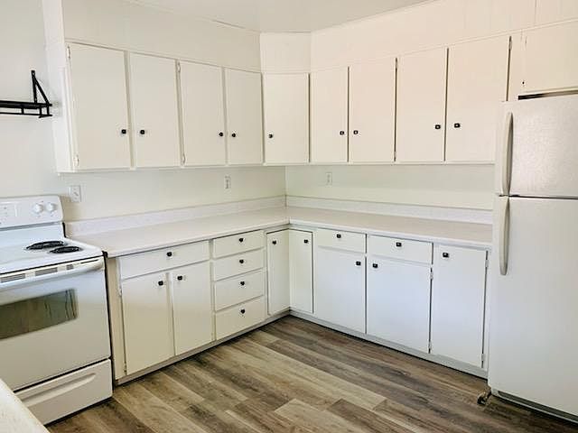 Brick duplex is located at 615 NW State St., upper unit (corner of State/Irving).