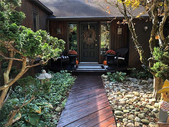 Stunning Cedar Contemporary on 4.2 woodsy acres, nestled in a picturesque private and serene setting you will enjoy for years and years! Featuring smart house technology and security, all 3 bedrooms can be main bedrooms, 2 have big full baths and the upstairs master suite is gorgeous with a deck to enjoy the private wooded setting. The lovely kitchen comes fully equipped with center island for dining and loads of cupboard space! Throughout the home Italian marble flooring blends with wood and ceramic, carpeting about 3 years old. Half bath and main level laundry too! Vaulted ceilings enhance living areas; the main level also has a den and large dining room. The lower-level family room has a stone floor to ceiling accent wall w/built in seating and pellet stove, party kitchen and additional storage room or office space. 2 pellet stoves will keep you cozy and add alternative heat options. Generous backyard has a fire pit, storage shed. 2 car detached garage. Close to RT 51, 43, 119!