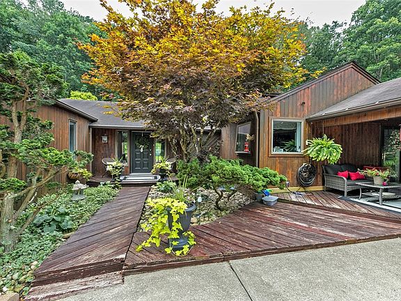 Stunning Cedar Contemporary on 4.2 woodsy acres, nestled in a picturesque private and serene setting you will enjoy for years and years! Featuring smart house technology and security, all 3 bedrooms can be main bedrooms, 2 have big full baths and the upstairs master suite is gorgeous with a deck to enjoy the private wooded setting. The lovely kitchen comes fully equipped with center island for dining and loads of cupboard space! Throughout the home Italian marble flooring blends with wood and ceramic, carpeting about 3 years old. Half bath and main level laundry too! Vaulted ceilings enhance living areas; the main level also has a den and large dining room. The lower-level family room has a stone floor to ceiling accent wall w/built in seating and pellet stove, party kitchen and additional storage room or office space. 2 pellet stoves will keep you cozy and add alternative heat options. Generous backyard has a fire pit, storage shed. 2 car detached garage. Close to RT 51, 43, 119!