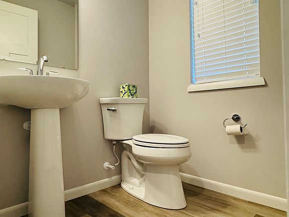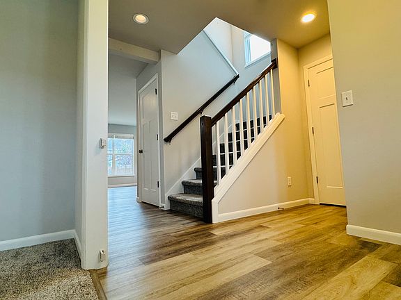 The main floor includes a bright, open-concept living area with a modern kitchen featuring stainless steel appliances, an island, and wood-style flooring.Upstairs, the primary suite includes a private bath with walk-in shower and a large walk-in closet. Two additional bedrooms and a full bath complete the upper level. A half bath is located on the main floor.