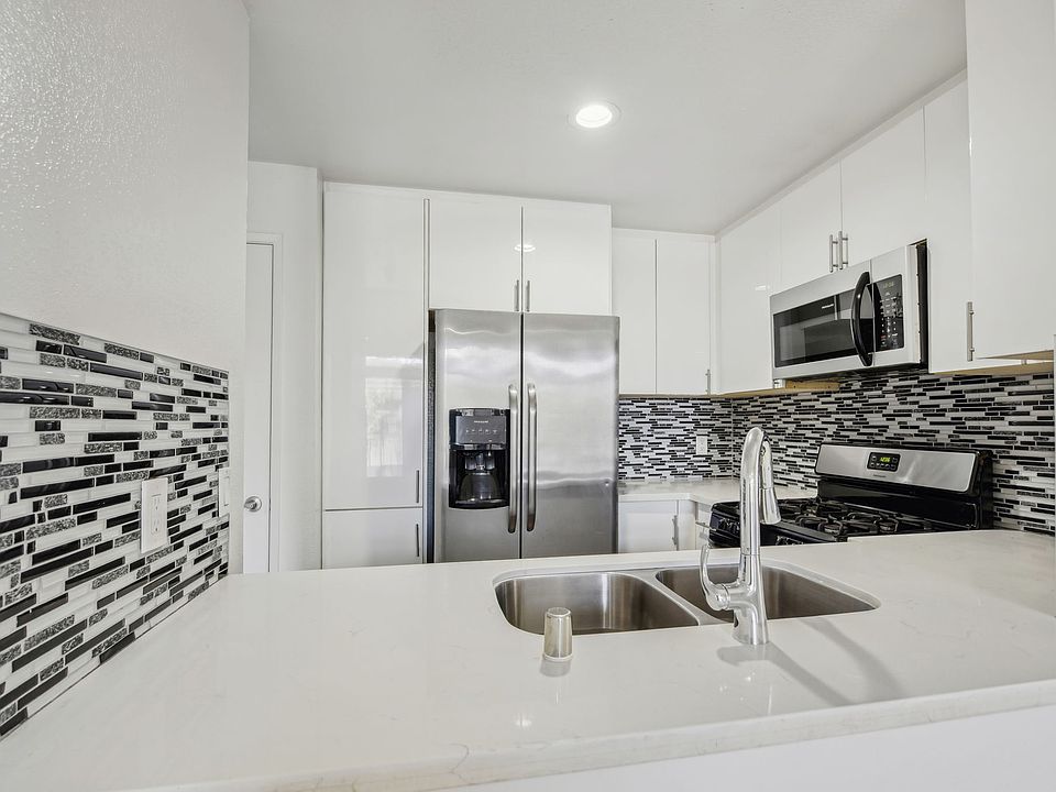 Stainless steel stove, dishwasher, refrigerator, microwave, and central air conditioner/heater