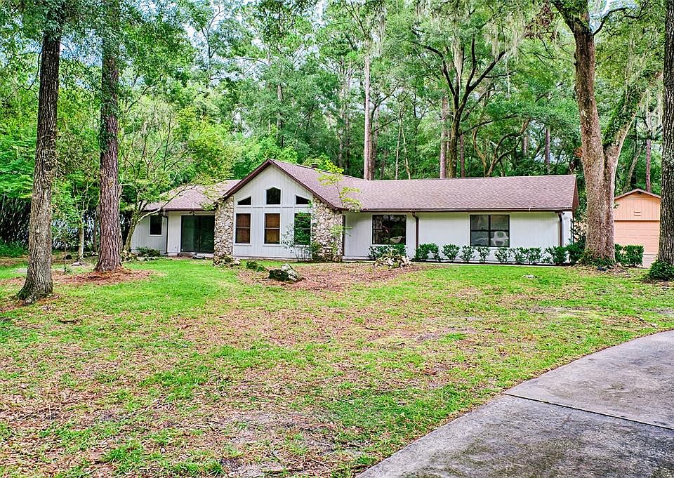 One or more photo(s) has been virtually staged. A remarkable opportunity to own a stunning 4-bedroom, 2-bathroom home on a private 1.09-acre lot in the sought-after Sunningdale subdivision, with no HOA! Tucked away at the end of a quiet cul-de-sac, this property offers the perfect combination of privacy and tranquility. With 2,285 sq ft of living space, the home features 3 bedrooms, 2 baths, and a versatile bonus room/flex space, perfect for a home office, playroom, or guest suite. The interior showcases beautiful hardwood floors throughout, with luxury vinyl in the bedrooms and bathrooms. The living room serves as the centerpiece of the home, with built-in shelving, a cozy wood-burning fireplace, and vaulted ceilings that add to the spacious feel. Sunlight streams through large windows, and the breakfast nook provides a peaceful view of the lush backyard. The home is equipped with modern conveniences, including updated appliances, a large laundry room, and a freshly painted attached garage. Recent upgrades include a new roof, newer A/C, and hot water heater. Outside, enjoy the serenity of the screened-in lanai, or take advantage of the detached garage with an open rear patio for outdoor entertaining. Freshly painted inside and out, this home is completely move-in ready. Located in SW Gainesville, this property offers both convenience and peaceful living—don't miss this exceptional opportunity!