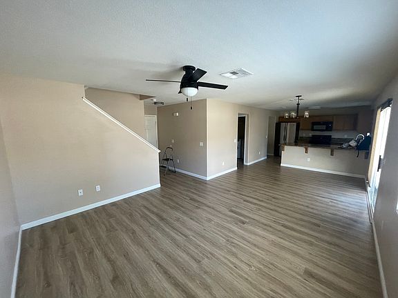 Newly painted indoors. Laminate flooring throughout home, polished porcelain floors in bathrooms upstairs, ceramic tile downstairs in half bath and laundry room. The kitchen has stainless steel refrigerator and dishwasher appliances, which are INCLUDED with the home. Washer and dryer are also included with rental.
