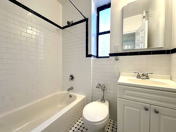 Renovated bathroomHigh ceilingsSpacious alcove studioTiled floorsPorcelain fixturesAmple cabinet spaceHardwood floors