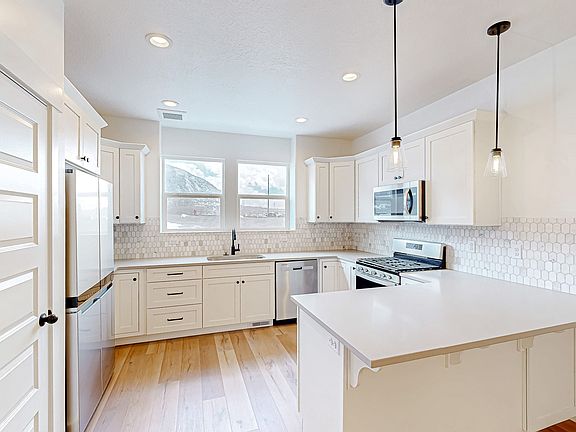 Brand new townhome in Harmony Ridge Community against the mountains in Mapleton with views from all bedroom and kitchen windows. Upgrades throughout the unit with upgraded quartz counters, cabinets, stainless appliances, tile bathroom floors, walk-in master shower, all upgraded laminate on main floor, and 30A EV charging outlet in the 2-car garage. Outside the front door is a grassy common area. Additional parking spaces are located right next to the driveway. Finished area is 1,700sqft with a 700sqft unfinished basement that can be used for storage. Fiber internet (1 Gig) and HOA fees are included in rent.