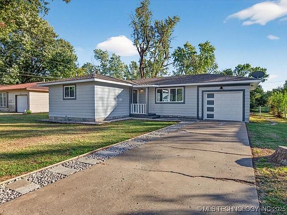 Dream of finding a home that is affordable but like brand new inside? Dream no more! Here is one right on Ironman Street in Nowata! You will love the color concept before you ever step inside. The new garage door is so tastefully painted. The covered porch going into the home is constructed to be strong, and you can tell it is. All the windows throughout the home are brand spanking new. The doors going into the home are new, also and once you get into the home, you will not want to leave. The open concept of the living area and kitchen is amazing! The floor is so beautiful. The kitchen is bright and clean and has plenty of cabinets. There is a door from the kitchen that leads to the garage, and out of the garage is a nice porch and a fenced-in yard. But let's stop and go back into the house. There is a coat closet in the hallway. The bedrooms are all nice size! There is plenty of closet space, so let's go shopping! The bathroom has a new vanity, new flooring, new mirrors, and a very nice shower. That is not all that is new! The central unit air conditioner, the hot water tank, the refrigerator, the stove top, the microwave, and the dishwasher are all new. The lighting throughout the house and the ceiling fans are new, also. The electrical has been updated. This house has been completely remodeled, and it is waiting for your family! Don't walk, but run to this house!