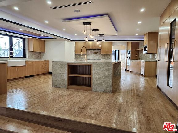 Exceptional two-story home in Ladera Heights, nestled in a peaceful cul-de-sac. This fully remodeled residence boasts two stunning kitchens, featuring an over-sized island with a convenient sink, adorned with luxurious Taj Mahal quartz counter tops and striking back splash. Equipped with top-of-the-line Wolf and Subzero stainless steel appliances including a refrigerator, freezer, wine cooler, range oven, coffee maker, microwave, speed oven and two dishwasher, this kitchen is a chef's dream. The second kitchen or butler's pantry enhances functionality, complete with its own subzero and wolf appliances, all accessible via accordion doors leading to the side yard. The impressive primary suite showcases soaring ceilings, a spacious walk-in closet, and a lavish en-suite bathroom that features a large soaking tub, a separate shower, dual sinks, and a pocket exterior door that over looks the rear yard. Every detail has been meticulously updated, with new plumbing, electrical systems, flooring, smooth stucco, and designer paint throughout. Both the main home and the charming pool house/retreat features a new presidential roof, all new light fixtures and chandeliers, while the property itself offers a private oasis with a sparkling pool, spa, and waterfall, complemented by fresh landscaping in both the front and rear yards. This unique home is truly a masterpiece, perfect for both entertaining and relaxation.
