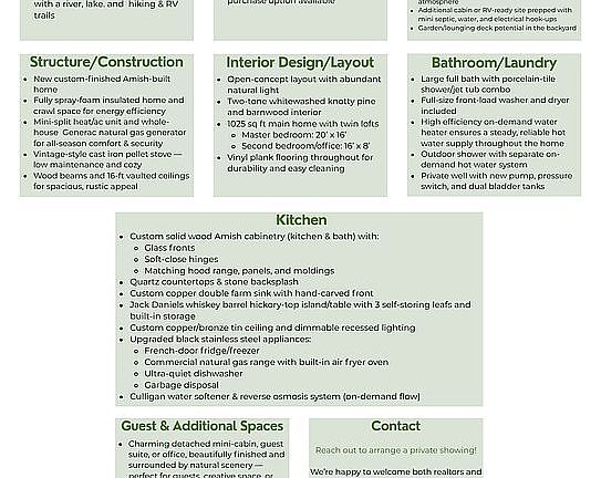 The Vinyl Plank Floors flow throughout the upper & lower levels & make for durable wear & easy cleaning. The seamless flow interior exhibits a Custom Kitchen showcasing Solid Wood Amish Bath & Kitchen Cabinets: w/ Glass Fronts, Soft Close Hinges, Matching Hood Range, Panels & Moldings, ‘Jack Daniels’ Double Whiskey Barrel Hickory Top Kitchen Table-Island w/ Stone Overhang includes 3 Self-Storing Leafs & Maple Wood Built-In Storage w/ Pull Out Cabinets. A Custom Copper Double Farm Kitchen Sink w/ Hand Carved Front, Quartz Countertops, Stone Backsplash, Upgraded Black Stainless Steel Appliances: French Door Fridge/Freezer, Commercial Top Natural Gas Range w/ Built-in Air Fryer Oven, New Ultra Quiet Dishwasher, Garbage Disposal, Culligan Water Softener & Culligan Reverse Osmosis Constant Flow On-Demand Water System, Custom Copper/Bronze Tin Finish Kitchen Ceiling & Dimmable Recessed Lighting. Never Run Out of Hot Water w/ an On Demand HWH, Outdoor Shower/Fenced Storage Area w/ Separate Outdoor On-Demand HWH. Large Full Bath with Full Size - Front Load Washer & Dryer & Porcelain Tile Design Shower/Jet Tub Bathroom. Well Maintained Private well with 2 newer bladder tanks, new pump & pressure switch all within a clean 5 block easy access insulated crawl space.