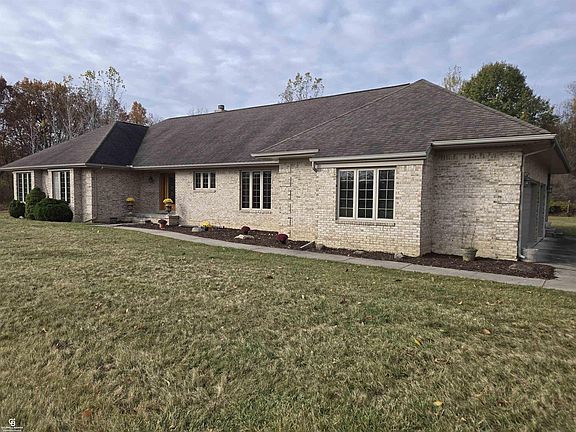 Sprawling, custom built full brick ranch with 2x6 construction on a private, 30.3 acre lot offering serenity in the countryside among the hardwoods and pines. Tongue & groove solid oak hardwood flooring in front foyer, kitchen, formal dining rm, & laundry rm. Remaining flooring wall to wall carpeting. Kitchen has granite countertops & includes island w/electric, solid oak kitchen cabinetry, food storage pantry, & breakfast nook. Formal living rm has zero clearance natural wood fireplace. Formal dining rm has sloped ceiling with skylight, allowing natural light to filter in plus 9 ft sliding door wall leading to a cement patio in a picturesque outdoor setting. Family rm includes second 9 ft sliding door wall which opens onto an expansive covered back porch. Bathroom vanities are solid maple, cherry, & mahogany. 3 car attached garage with O/H door opener. Basement is poured & includes egress window suitable for finishing. Brand new dual fuel heating/cooling system. 30x40 pole barn w/insulated roof, wood stove, & electric. Pond needs a little attention but has great potential. This country estate has fresh paint throughout & will not disappoint.