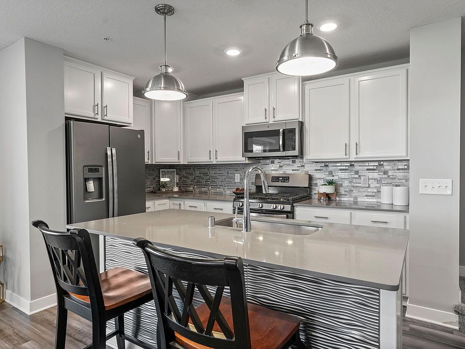 Inside, you’ll find brand-new paint throughout and a bright, open-concept main level with luxury vinyl plank flooring, large windows, and an inviting layout ideal for both daily living and entertaining. The kitchen shines with stainless steel appliances, white cabinetry, a center island with seating, flowing seamlessly into the dining and living spaces.