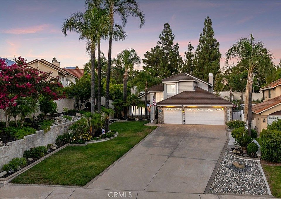 Remodeled Pool Home with Stunning Curb Appeal and Expansive Backyard. Welcome to this beautifully remodeled pool home nestled on a deep lot, offering exceptional curb appeal and refined living both inside and out. The front yard showcases lush green grass, manicured planters, an elevated retaining wall, soaring queen palms, a rock garden, and river rock accents that enhance the home's exterior charm. A custom concrete walkway leads to a welcoming covered porch with elegant iron and glass double entry doors. Step inside to travertine tile flooring and an impressive sweeping staircase that sets the tone for the rest of the home. The formal living room features vaulted ceilings, a custom fireplace, and a dramatic picture window that frames views of the beautifully landscaped front yard. Adjacent is the formal dining room, complete with a chandelier and plantation-shuttered window overlooking the backyard—perfect for entertaining. The updated kitchen is a chef’s delight, featuring classic white cabinetry, granite countertops, a tile backsplash, recessed lighting, a sunny breakfast nook, and peninsula seating that opens seamlessly to the family room. The family room continues the flow with travertine flooring, a striking river rock fireplace, built-in cabinetry, and sliding glass doors that lead to the private backyard oasis. Downstairs also includes a well-appointed bedroom and a bathroom with a frameless glass shower—ideal for guests or multigenerational living. A spacious laundry room offers direct access to the three-car garage. Upstairs, the spacious primary suite impresses with vaulted ceilings, sliding doors to a private view balcony with sweeping neighborhood and mountain views, and a spa-like bathroom featuring dual sinks, a makeup vanity, a custom tiled shower with frameless glass, and a separate soaking tub. A generous walk-in closet with mirrored doors completes the retreat. Two additional upstairs bedrooms share a Jack and Jill bathroom with dual sinks and updated finishes. Step outside to a resort-style backyard designed for relaxation and entertaining. Enjoy a sparkling pool and spa, covered patio, expansive concrete decking, fire pit, artificial turf, and beautifully landscaped grounds—all surrounded by privacy-enhancing stucco walls. This turnkey residence combines elegant design, thoughtful upgrades, and incredible outdoor amenities—an exceptional opportunity in a prime location.