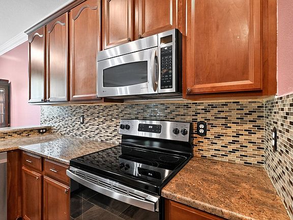 Kitchen: Features granite countertops, real wood cabinets, a large pantry, stainless steel appliances, breakfast bar, and a spacious center island.