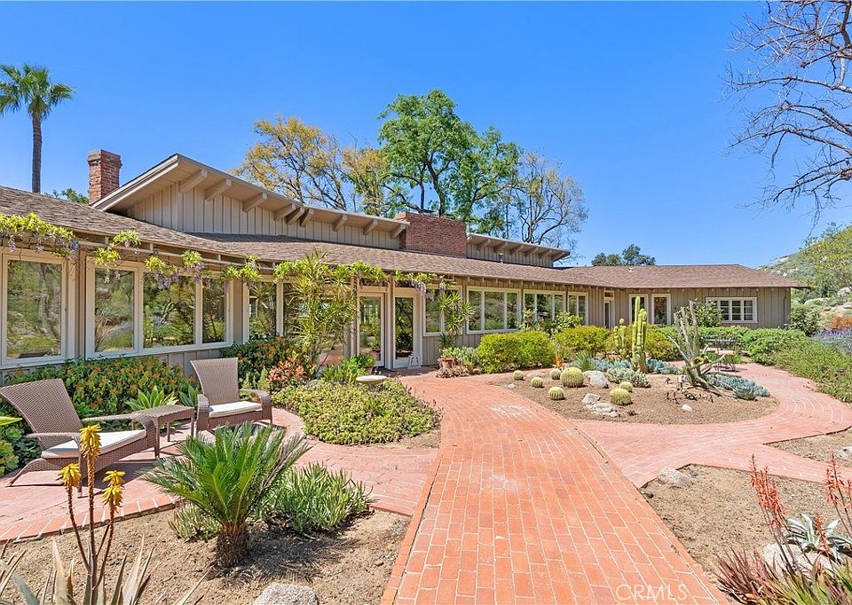 Nestled at the top of the hill in the Hawarden Hills neighborhood, this ranch-style home stands as a crown jewel. As you drive up the long private driveway, you’re going back in time to Riverside’s historic citrus heritage. Beyond the orchards, the panoramic view is nothing short of breathtaking. This home boasts a mid-century style all its own. Entering the front gardens, a pathway leads you past succulents and cacti to the front door. The expansive enclosed loggia entry runs the entire length of the home with an east-facing wall of windows. The loggia has a large brick fireplace, a powder room guest bath, tile floors, sitting areas, and storage galore. The kitchen, dining room, and living room create one open great room. Here there are vaulted open beam ceilings, parquet wood flooring, built-in bookcases and storage, a second fireplace, and windows and French doors looking out to the backyard’s patio. The kitchen features mahogany wood counters, an electric cooktop, an oven/microwave, and more storage than you’ll ever need. Speaking of storage, the walk-in pantry houses not only staples but also a custom wine and beer refrigerator and a 2nd oven. This living area was built to entertain! The kitchen’s high counter bar opens directly to the dining and living rooms. French doors lead out to the newly designed patio giving you California-style indoor/outdoor living spaces. There are 3 bedrooms in the main home. Each bedroom is private with wood floors and en-suite bathrooms. The double Dutch doors leading to each room add character and charm. The spacious primary bedroom suite has a third fireplace, built-in bookcases, a large walk-in closet, and a full attached bathroom. In the ADU you’ll experience the same views enjoyed from the main home. This space is 560 sq ft and includes a full bathroom. This home sits on two lots equaling over 3 acres of citrus and avocado groves, pathways, rocks to climb, and flowering plants. The two-car garage is across a brick parking pad which, when combined with the DG pad beyond can accommodate your guests. The back side of the garage also has a large storage room. A bonus is the NEW paid for 22-panel, 8kw solar system which is enough to power the entire home based on current usage. In this home, time slows down. In the heart of the city, you’re above it all. Sunsets become rituals, and the view becomes a cherished companion. Welcome home.