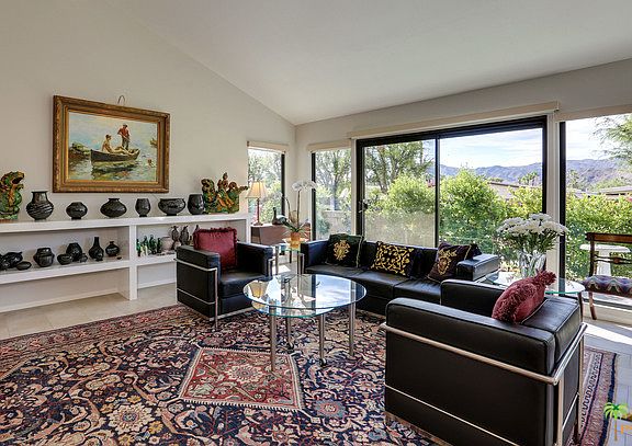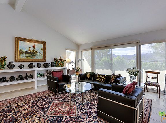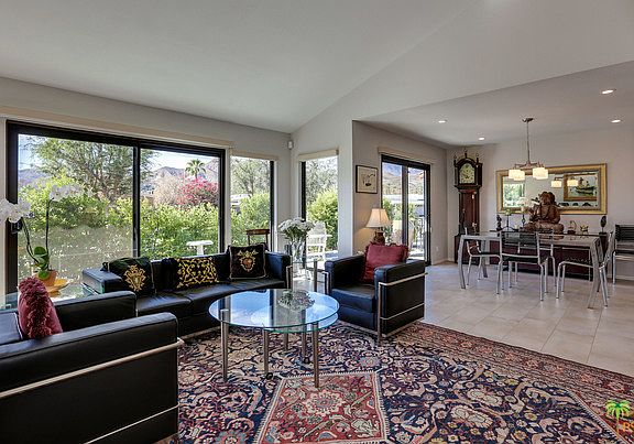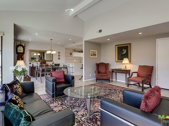 Sleekly modern and sophisticated condo in South Palm Springs' Sandcastles is move-in ready. Renovated in 2014 with superior finishes and custom design. Top of the line stainless appliances, including Bosch plus quartz countertops and marble, full-height backsplash define the stylish Kitchen. Bathrooms have been done with the same attention to detail. High energy efficient doors and windows with custom window treatments make this an ideal full time residence. Cathedral ceilings, Porcelain tile floors, Hansgrohe faucets, natural stone showers with custom frameless-glass enclosures are hallmarks of the fine finishes. End unit with attached two car garage, laundry in unit, spacious outdoor living spaces and mountain views make this a desirable unit.