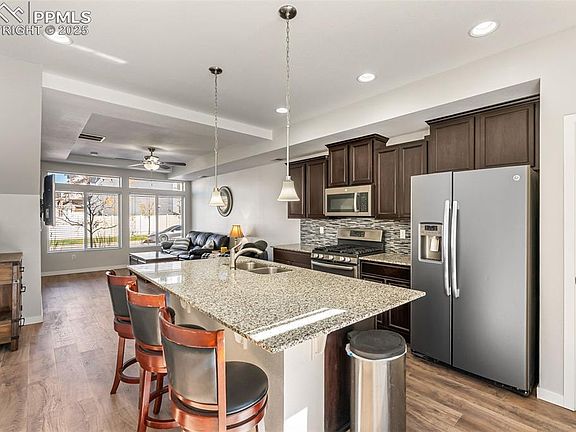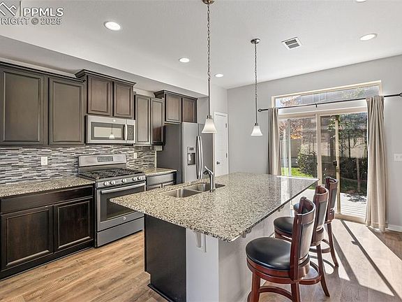 Welcome to this beautifully maintained home located in the highly desirable Banning Lewis Ranch community, offering a perfect blend of modern comfort and neighborhood charm. Step inside to discover new luxury vinyl flooring that flows throughout the main level, creating a warm and inviting atmosphere. The gourmet kitchen is a true centerpiece, featuring stainless steel appliances, a gas range, granite countertops, tile backsplash, pantry, center island, and breakfast bar—ideal for everyday living or entertaining guests. The kitchen opens to the bright family room and offers a convenient walkout to the rear deck and fully fenced backyard, perfect for relaxing or hosting outdoor gatherings. A half bathroom completes the main level. Upstairs, the spacious primary suite offers a peaceful retreat with a walk-in closet and a luxurious 4-piece bath showcasing ceramic tile, dual vanities, and granite countertops. Two additional bedrooms, a full bath, and a laundry room provide convenience and functionality. The impressive third-level loft is flooded with natural light and offers endless possibilities—home office, media room, or guest space—and opens to a private rooftop patio, an ideal spot to enjoy morning coffee or evening sunsets. Additional highlights include an attached 2-car garage with EV charger and energy-efficient features throughout. Living in Banning Lewis Ranch means access to outstanding amenities including a community center, fitness facility, pool, walking trails, dog park, and playgrounds. Conveniently located near shopping, dining, and schools, with easy access to major routes for commuting. This home truly combines modern living, thoughtful design, and resort-style community living in one of Colorado Springs’ most sought-after neighborhoods.