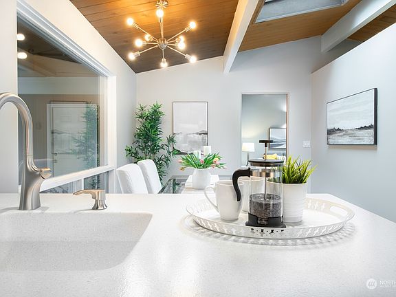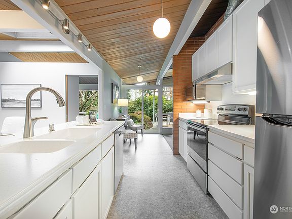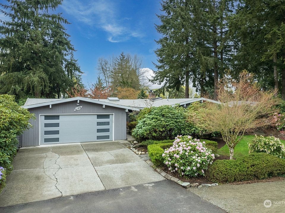 Remarkable mid century garden home preserved and maintained like a collectible. A coveted 5 car garage that is insulated & drywalled allows for endless possibilities. This corner lot sits on a peaceful dead end and is flourishing with bright florals, mature rhododendrons, garden pathways + endless privacy. Home is all one steady level filled with picture windows, updated kitchen & baths, vaulted rooms and a cozy living anchored by a fireplace all extending to a twinkling covered patio. A bedroom wing comprised of 3 rooms each with a private garden view. Large bonus den plus an office. Location is in desirable Uplake neighborhood w/Northshore schools & a quick jaunt to Burke Gilman Trail, amenities, Kenmore air, golf/tennis & Log Boom Park.