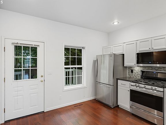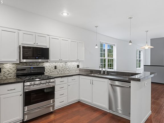 Let's go for a walk--this amazing location offers local restaurants, grocery, coffee, pizza, waterfront paths, huge parks, and so much more! You don't even need a car! This 'end unit' offers a HUGE oversized 2 car garage/storage(maybe even 3 cars!), upgraded kitchen, upgraded wood flooring on the main floor, A/C, upgraded primary suite bath, gas fireplace, TONS of natural light, high ceilings, and a wonderful peaceful back yard deck, patio and gardening area! Kitchen includes slab granite counters, stainless steel appliances, and classy glass backsplash! Roof replaced 2020, exterior painted 2023, furnace replaced 2019, windows replaced 2015--a lot of your potential expenses have been addressed! You will love this place! [Home Energy Score = 5. HES Report at https://rpt.greenbuildingregistry.com/hes/OR10242346]