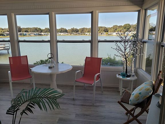 Forest Lake Estates is a 55+ age qualified active and vibrant community with tons of amenities such as pickleball, tennis, brand new fully equipped gym, 2 pools, fishing lake, shuffleboard and so much more. This exquisite 1,092 sq ft 2 bedroom 2 bathroom home comes fully furnished and move-in ready. This waterfront homes has open-concept floor plan, beautiful new floors, natural light, and exceptional views. There is laminate flooring throughout the home, with newer stainless steel appliances in the spacious kitchen. Enjoy sunny Florida living with a four seasons room and screen in porch that both face the lake. The guest bedroom can comfortably accommodate a queen size bed, which is only a few steps away from the guest bathroom. The spacious primary bedroom has a walk-in closet with ensuite bathroom and walk in shower. Come make this peaceful, waterfront retreat your dream home. Call for your private tour!