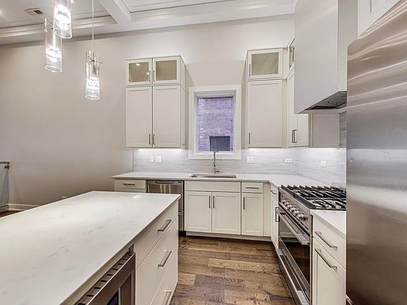 This exceptional 4-bedroom, 3-bathroom duplex in the heart of Edgewater offers the perfect blend of refined design, upscale finishes, and spacious living. From the moment you enter, you're welcomed by a light-filled open layout featuring 12' coffered ceilings, rich dark-stained oak hardwood floors, and a cozy gas fireplace that anchors the expansive living and dining area. A unique three-sided covered atrium creates a peaceful retreat for morning coffee or evening relaxation, seamlessly connecting the indoor and outdoor experience. The chef's kitchen is thoughtfully appointed with Fisher & Paykel appliances, quartz countertops, a striking glass mosaic tile backsplash, a large center island ideal for cooking and entertaining, transitional white cabinetry, and elegant designer lighting throughout. The primary suite is a true sanctuary with custom his-and-her closets featuring built-in cabinetry, a private balcony, and a spa-like marble bathroom with a rain shower, body sprays, double vanity with quartz countertop, and high-end fixtures. The lower level features a spacious family room with a wet bar and wine fridge, plush carpeting, a large laundry room with full-size washer and dryer, and ample storage. Additional highlights include split-system air conditioning with humidifier, one garage parking space included in the price, and one of Chicago's rare rooftop decks offering sweeping views of Lake Michigan. Located in vibrant Edgewater-just a short walk to the lakefront, you're minutes from Lane Beach and Hollywood Beach, and steps to the Granville and Thorndale Red Line stations for easy access to downtown. Enjoy being close to Metropolis Coffee, Whole Foods, Edgewater Library, Andersonville shopping and dining, Loyola University, and scenic bike paths along the lake. This home offers exceptional comfort, character, and convenience in one of Chicago's most charming and connected neighborhoods. A truly special opportunity not to be missed.
