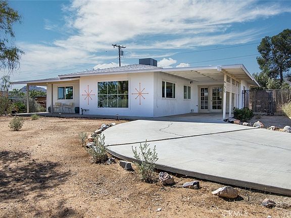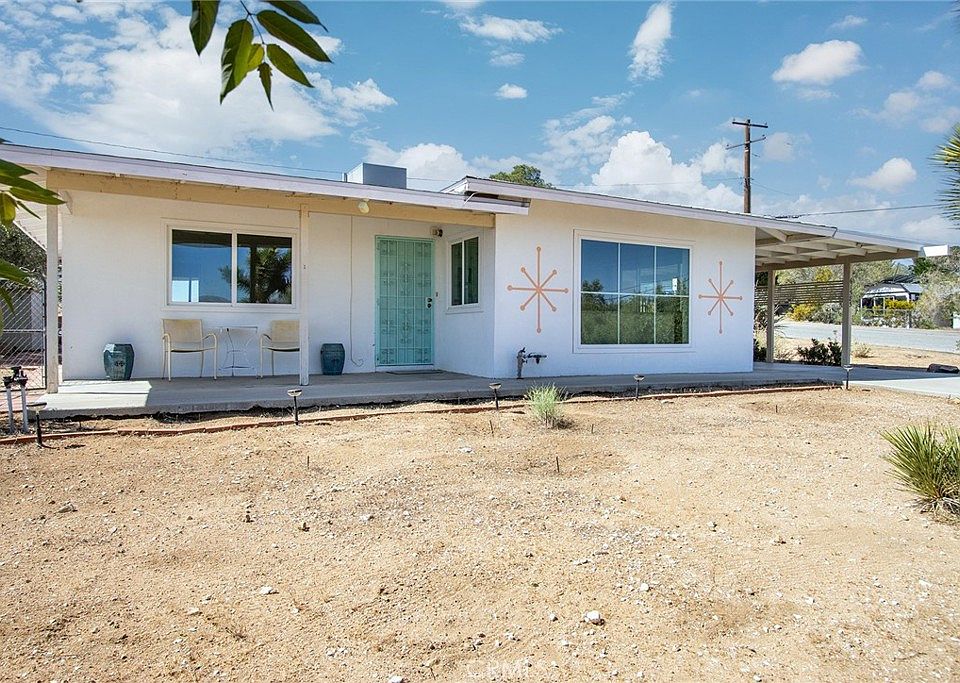 The Atomic Desert Dream House: Your retro-futuristic, authentic mid-century modern getaway that bridges the past and present. Very few mid-century properties exist in Joshua Tree, and this may be the only example preserved in mint, near original condition — complete with veneer wood cabinetry in the kitchen, period antiques, and vintage tile work in the bathroom. Discover this spacious, 3-bedroom, 1-bathroom 1,249-square-foot dwelling with upgraded appliances and central air-conditioning/heating. The third bedroom/bonus room is an extra-large flex space. A new roof was installed after present owner purchased property, as well as terrazzo-style tile floors, and double-pane windows throughout. Viewed from the interior, a joshua tree stands in the front yard framed by the large front window. The home is positioned on a corner lot with an empty lot across the street and behind the house for added privacy. With meticulous desert landscaping, several mature olive trees add yet another layer of seclusion. A high-quality block retaining wall demarcates the backyard. Two sheds provide ample space for storage, in addition to the enclosed laundry room, which could be converted into a large work-from-home space. The property also features a covered carport for efficient, Jetson-style parking. Sold turnkey/fully-furnished! All decor and furnishings are inspired by the American “Atomic Age,” which was the 1960s visualization of space-age style. Incredible location — walking distance from downtown Joshua Tree, and a short drive to Joshua Tree National Park. Cozy southside neighborhood. Presently used as a part-time residence and part-time Airbnb to be delivered seamlessly to buyer looking for same. For mid-century aficionados, look no further for perhaps the most affordable example in SoCal.