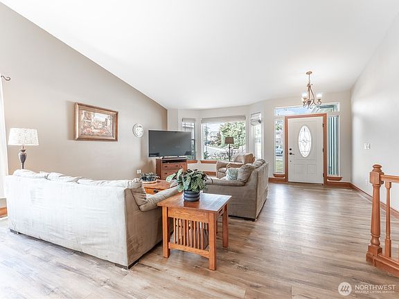 This beautifully appointed daylight home offers bright, airy living spaces. The main floor features an open concept with a spacious living room, vaulted ceilings & luxurious vinyl plank flooring. The chef’s kitchen includes double ovens, a large center island, granite countertops, and scenic views from the dining area. The primary suite, located on the main floor, has an ensuite with a jetted tub, walk-in shower, double vanity, & walk-in closet. A guest room with a full bath is also on this level. The lower level offers two large bedrooms, a huge family/rec room with gas fireplace, and a sizable laundry room with office space. Outside, enjoy a large deck with Cascade Mountain views and a flat, fenced backyard nestled on a quiet cut-de-sac.
