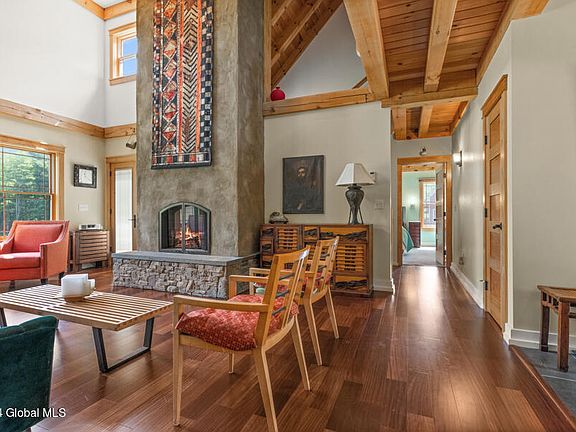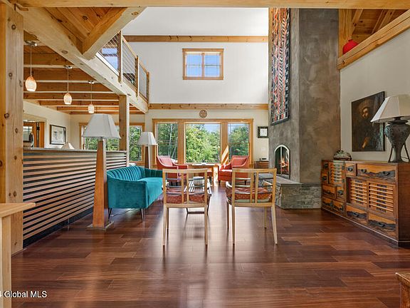 This young custom Cape-style home radiates sleek elegance, blending modern design with vaulted wood ceilings and intricate woodwork. A striking stucco fireplace anchors the open-concept great room and chef's kitchen, featuring unique Chinese-style cabinetry & floor-to-ceiling windows. The private wing offers a primary bedroom with a luxurious en-suite bath, complete with a glass vanity, standalone tub & walk-in shower. The expansive second-floor loft suits an office or the third bedroom, complete with a full bath. A tranquil sunroom crowns this exquisite home. The walk-out basement, with garden windows and a wood stove, offers potential for additional living space. Enjoy radiant flooring across five zones, a Trex deck overlooking a picturesque pond, 10+ acres of privacy & a circular drive