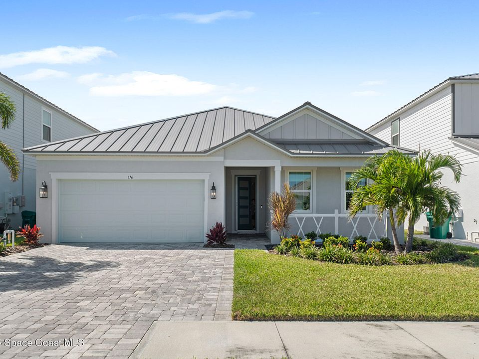Just steps from the beach, this beautiful coastal contemporary home, built in 2023, offers the perfect beachside retreat. Featuring 3 bedrooms, 2 bathrooms & a dedicated home office, it's ideal for relaxing and working from home. The open living area is filled with natural light, vaulted ceilings & stylish tile floors. The chef's kitchen provides quartz countertops, stainless steel appliances, a built-in double oven, a butler's pantry & a large island with bar seating—perfect for gatherings. The primary suite provides a spa-like en suite and a spacious walk-in closet, while two additional bedrooms & the bright office offer flexible spaces for family and guests. Enjoy added convenience with a community pool, a 5' extended garage, impact windows & doors & modern finishes throughout. Located within walking distance to the beach, shopping, & dining & just a mile from Patrick Space Force Base, this home combines coastal charm with modern comfort for the ultimate relaxed lifestyle.