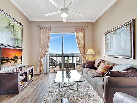 Rarely available, 2 bedroom, 2 bathroom lower penthouse unit with unbelievable lake and West facing views. The floorplan offers 2 separate suites with private bathrooms, so your guests can have their own wing. The unit features crown molding, and vinyl flooring throughout. The 12 foot volume ceilings make this unit feel even larger than it is. Finish up your day with a glass of wine on the balcony and take in the sunset views. Washer and dryer in the unit. There are also 2 parking spaces that come with the unit, a rarity downtown. The owner has taken care of the special assessment in place for the roof. The building is well maintained and the staff is very friendly. Just a couple minute walk to tons of bars, restaurants, shopping, jogging trails and the intracoastal. The building has incredible amenities, including a resort style pool, spa, business center, community room and fitness center...everything you need in one place. This is an investor friendly building, as units can be rented out immediately. Make an appointment to tour your next home today.