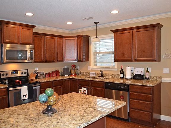 This gorgeous 4 bedroom home is in the beautiful community of Glen Lake. Located on a small street with a cul-de-sac, it's segregated away from most of the traffic of the subdivision. The lot is rather large and fully privacy fenced in with a covered back porch, including a fan and an extended patio. As you come upon the home, you'll see the large front porch with plenty of room for a few chairs to enjoy the day. Entering the home, you notice how open it immediately feels. The 2-story foyer opens up into a very large great room with a gas log fireplace and a built-in entertainment center. The dining room is also presented from the foyer with it's beautiful arched accents, adding to the open-feel of the entire first floor. The breakfast area sits between the large kitchen and the great room. The gorgeous kitchen has granite countertops, stainless steel appliances, a huge walk-in pantry, recessed lighting, and dark wooden cabinets. The half bath and the laundry room are located to the left of the kitchen, both with ceramic tile flooring and storage cabinets in the laundry room. The entire first floor, outside of the half bath and laundry room, is covered in dark hardwood flooring and accented with chair railing, crown molding and rope lighting along the ceiling. Once you hit the stairs, you'll notice that the second floor is mainly carpeted with the exception of the bathrooms, which have ceramic tile. Up the stairs immediately to the right is the master bedroom with it's connected master bath. The bedroom has a trey ceiling, crown molding with the rope lighting feature, a ceiling fan and closet. The master bath has a large whirlpool tub, a double vanity with dark wooden cabinets, and an absolutely gorgeous walk-in shower. The walk-in shower has been structured with a built-in bench and shelf, accented with a pebble floor and ceramic tiles covering the walls. The other 3 bedrooms each have their own ceiling fans and walk-in closets, with the exception of the last bedroom on the right which has a regular, single closet. The full bath is at the end of the hallway with very large single vanity with dark cabinets and a shower/tub combination. The 2-car garage has a walkway that leads to the side entrance. With all of the beautiful extras and amenities that go along with the home, not including the great location and wonderful subdivision, how can you not just fall in love with this house?