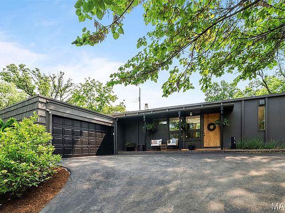 You'll fall head over heels for this exceptional California-style mid-century modern treasure designed by local architect Harris Armstrong. Perfectly positioned on a peaceful Kirkwood cul-de-sac, this 1962 ranch blends timeless design and thoughtful updates. Natural light fills this beautifully maintained 2 bed/2 bath home thanks to newer windows ('19) and soaring 9.5-foot ceilings. The floor plan is perfect for entertaining and family living, with the living room open to the dining room and kitchen. You'll love the gas fireplace featuring original penny tile, breakfast bar, quartz counters, open shelving, white cabinets, and stainless steel appliances. Stylish light fixtures complement the clean lines of the home. Both updated bathrooms showcase wonderful tile-work. Ample storage throughout: custom cabinetry in the laundry room & each bedroom has dual floor-to-ceiling closets w/Elfa shelving. Off the 2-car garage you'll find a bonus room/office w/skylight. Recent updates include interior painted '22, exterior '20, and professionally designed native garden '21 w/rock top French drain. The private shaded back patio creates ideal space for grilling and relaxing with friends and family. Additional improvements: driveway '19, aggregate concrete patio '21, front landscaping w/retaining wall '19, blinds '19, and HVAC '21. You'll be walking distance from Kirkwood Park and all of the shopping and restaurants Downtown Kirkwood has to offer! Don't miss out on this unique opportunity!