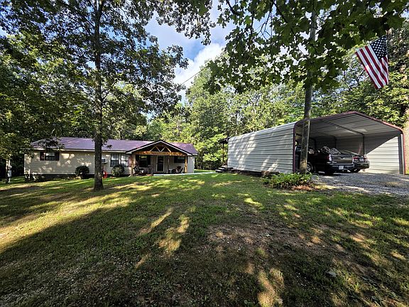 Outside, enjoy relaxing on the covered front porch or take in the peaceful surroundings from the spacious yard. The 2.62 acres provide room to garden, play, or expand, with mature trees offering shade and privacy. The property also includes a two-car detached metal carport, outbuilding, and concrete walkway with easy access to the home.