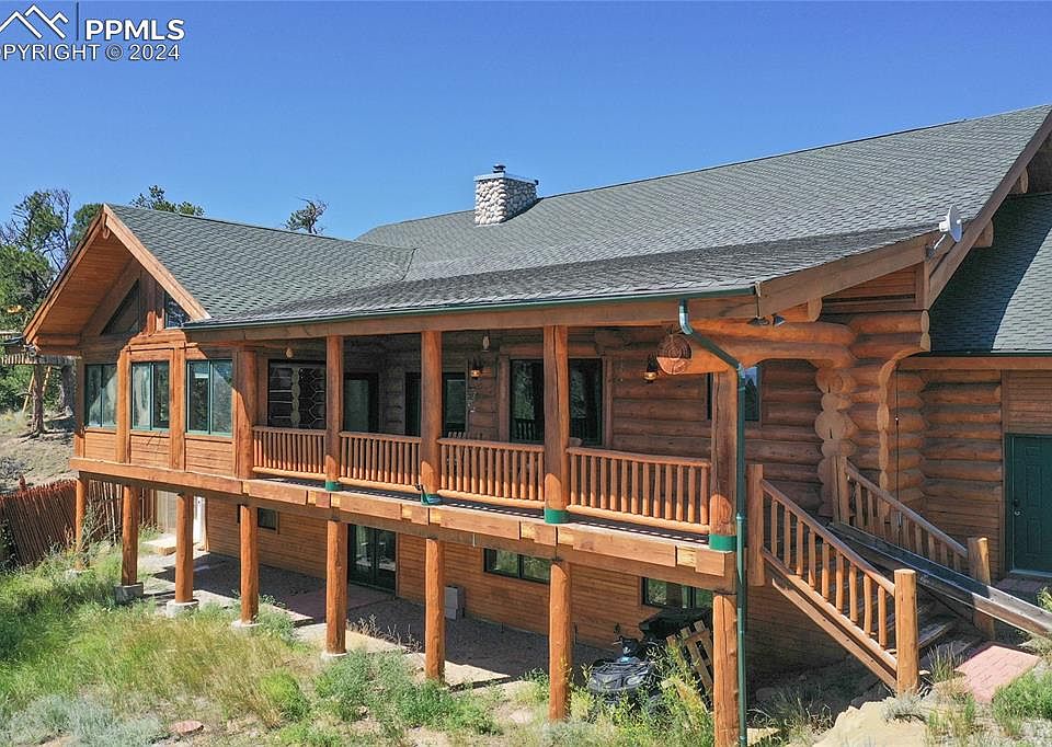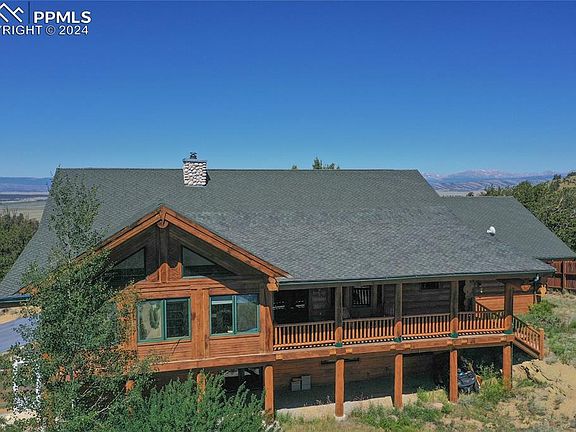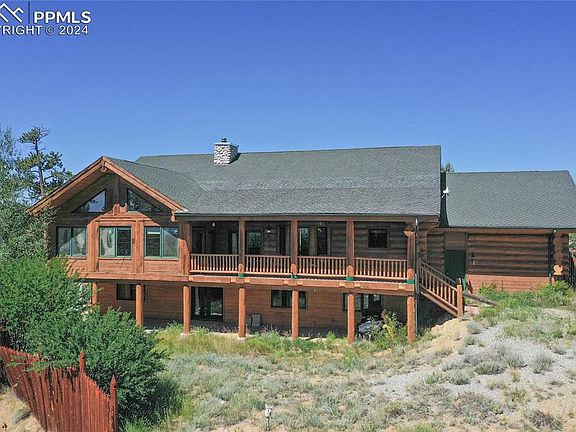 Flying High Lodge is a high-energy Colorado destination hub w/“mountains of outdoor recreation” for memorable family gatherings, vacation rentals & endless excursions. Arrive at its impressive log entryway & proceed up to a secluded plateau where views of the snow-capped Rockies & majestic Pikes Peak will rise up to greet you. Explore, hike, hunt, camp around a diverse 72.50 acres w/mix of aspen, pine, spruce & bristlecone’s. Relax in a rocker on its (2) covered decks to catch quiet moments between peaceful sunrises & glorious sunsets. Watch for movements of native area wildlife such as mule deer, elk, bear & other small game & easy to spot red-tail hawks & eagles soaring the skies. Flying High Lodge offers a unique opportunity to experience that one-of-a-kind Colorado high ~ from the stunning scenery to its cozy feel. Spacious 5,584 SF Pacific Log Home built w/large diameter British Columbia timbers. Generous great room accented by soaring vaulted ceilings, stone/wood-burning fireplace & open to kitchen/dining/laundry & sunroom. Artful touches ~ colorful stained-glass designs, carved wood doors w/hammered steel hardware. Kitchen equipped w/granite tops, gas cooktop, double oven, center bar. Main level showcases a master w/sauna, free-standing tub, granite tops & oversized shower & guest bedroom (w/loft). Lower level includes family/game/exercise area, guest bedroom w/bath & “other” flex room. Ample storage w/walkout to patio, fenced yard w/access to a small greenhouse & even a few chicken coops (perfect for fresh produce & eggs!) Detached 2-car garage w/loft provides more guest space w/ bedroom/kitchenette/ bath & sauna. Land is comprised of (2) adjoining parcels for more building options (home/cabin/outbuildings.) Freedom to dream w/o added restrictions – No HOA/No Covenants. Off the beaten path yet only 3.8 miles from paved Hwy 24. Close to major ski resorts (Breckenridge 45 minutes). Elevate your mountain adventures and make a landing at Flying High Lodge!