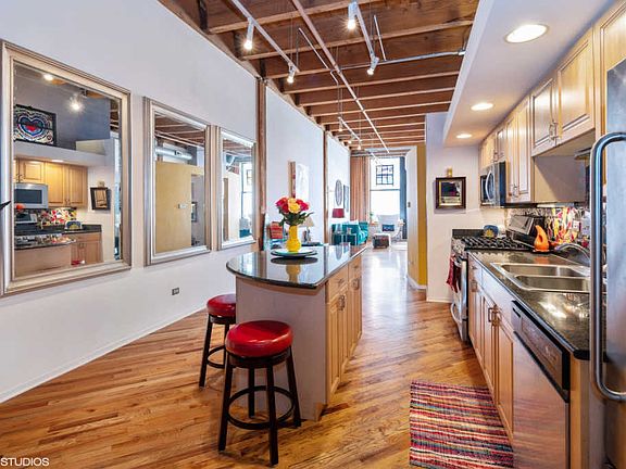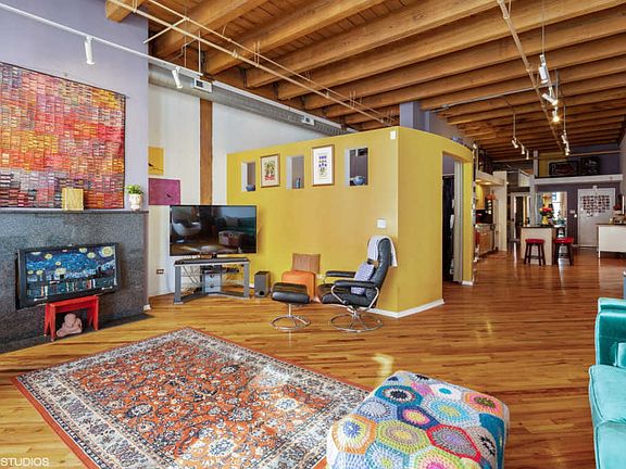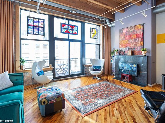 Beautiful 2 bedroom, 2 bath timber loft condo. Soaring ceilings with Floor to ceiling windows offer tons of natural light. Private balcony with breathtaking north city views. Spacious open concept layout with 15' ceilings & fireplace. Solid 3/4 inch Hardwood floors on diagonal compliment interior throughout! Granite kitchen with eclectic backsplash and stainless appliances. Island for extra prep/eating space. Spacious master bath w/ ensuite bathroom. Master bedroom finished with walk-in closet. Extra large private balcony for world class views and perfect for dining el fresco and entertaining. Bonus 14X10 storage room across the hall with 14' ceilings for a home office option! Deeded heated garage Parking Space INCLUDED IN PRICE. Security guard, elevator building with exercise room, right in the heart of West Loop/Fulton Market! steps to the Metra, Green Line train, Restaurant row, Jewel grocery, Nightlife, and Shopping. Tremendous mid rise elevator building! This one will stand out from the rest.