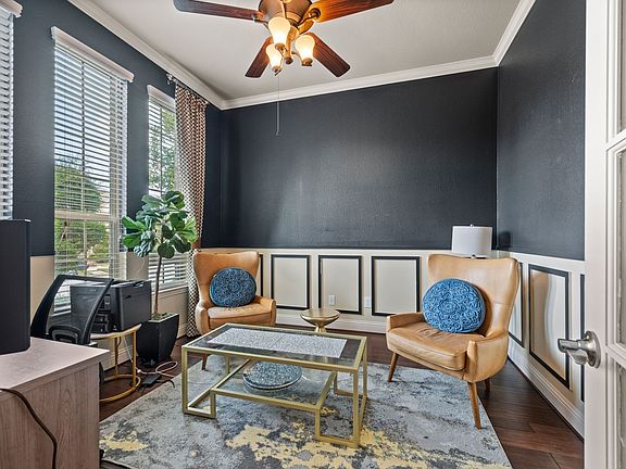 Former Lennar Model Home with all the upgrades! This beautifully designed home offers both style and function, with a spacious open layout and thoughtful details throughout. The family room features a cozy fireplace, soaring ceilings, and a wall of windows that fill the space with natural light and overlook a large covered patio — perfect for entertaining or relaxing. The primary suite and a secondary bedroom are conveniently located on the main floor, along with a private office accented by elegant glass doors. You'll also find a formal dining room with stunning wainscoting that adds a touch of classic charm. The kitchen boasts white cabinetry and countertops, and opens to a bright breakfast nook surrounded by windows. The adjacent living area flows seamlessly, enhanced by custom window treatments and views of the beautifully manicured backyard framed by iron fencing for an open, expansive feel. Upstairs, enjoy a large game room and a dedicated media room — ideal for movie nights or family fun. Enjoy access to the community pool, and beautifully landscaped front and back yards that complete this exceptional home.
