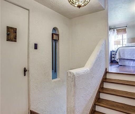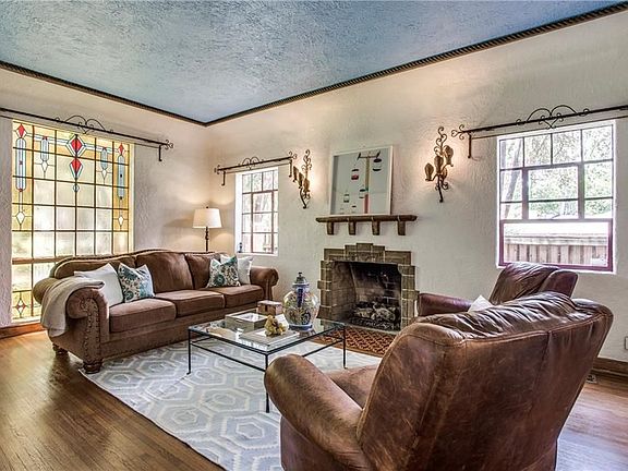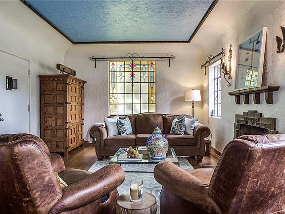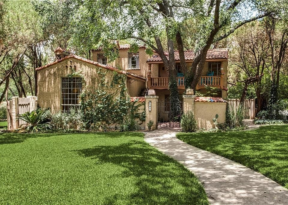 This home is situated on a beautiful over-sized corner lot in Lakewood. This is a Hutsell designed, eclectic Spanish home with tile roof, gated front courtyard with stone patio and outdoor fireplace. There is a staircase leading to the second floor, covered balcony. Enter to hardwoods, cove ceilings, stained glass, and masonry fireplace in living area. Dining offers storage and entry to the two car attached garage. The kitchen has decorative tile, dual sinks, walk-in pantry and four-burner gas range. The split level upstairs has a full bath with linen closet. Next to the second bedroom is the covered patio, accessible from both inside and out. The master is located on the upper half of the second floor and offers dual closets. The large backyard is landscaped and boasts board-on-board fence and gate. Plenty of possibilities for the right buyer. Enjoy!