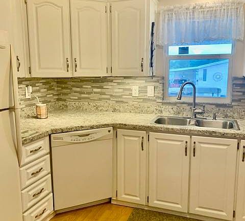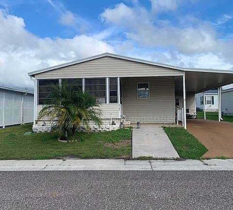Welcome Home! This approximately 1100 sqft home is in a Premier Park and is directly across the street from the lake, providing nice views from your covered Porch or Lanai. It is also close to the Clubhouse and Amenities. Outside is a beautiful Palm tree, new Brick Planter, covered Porch, extra cement drive for your Golf Cart, Long, Painted Driveway, and a shed for Laundry and storage. Inside is there is a nice flow between the Kitchen, Dining and Living rooms. The Kitchen has all new cabinet fronts and hardware, a new sink/faucet, new counters and a new backsplash. It also has a nice eat-up bar. The dining room has a lovely round table, new ceiling fan and 2 extra dining hutches. The living room has 2 power reclining sofas, new flooring and a new ceiling fan. This room has a slider the opens to the Lanai. The Lanai has the extra wind/rain/sun shields over the screens too. You'll make this your favorite room! Especially with the peek-a-boo views of the Lake. The hallway has a built-in desk which is great. And there is a nice size Guest room and Full Bathroom with updated Vanity and a tub/shower combo. The primary has a double door entry and a beautiful King Canopy Suite. The Bathroom is directly connected and has a separate new shower and toilet. The Current lot rent is 652 Until May 2026, so this will give you a year of savings before it goes up to Market Value! This home has a Metal Roof, CPVC pipes, and Vinyl windows. There is also updated Vinyl flooring in the Living room, and 2 Bedrooms, so there is no carpet. FOREST LAKE ESTATES IS A 55+ LAND LEASE COMMUNITY. THE MONTHLY LOT RENT FOR THIS HOME includes lawn care, pass through tax, trash, 24 hour gated access and use of all amenities. FOREST LAKE ESTATES FEATURES TWO HEATED POOLS, HEATED SPA, SPACIOUS SUN DECK, TENNIS COURTS, PICKLE BALL COURTS, SHUFFLEBOARD COURTS, A BASKETBALL COURT, HORSESHOE PITS, 18 HOLES OF PUTT-PUTT GOLF, 2 DOG PARKS, STOCKED FISHING LAKE, & DOCKS. THE CLUBHOUSE HAS A DANCE FLOOR, YOGA, & EVENTS. Showings are available via Face-time (live video of property) -OR- scheduled showing by appointment.