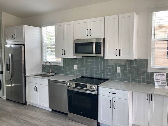 Contemporary bathroomGleaming quartz countersBright floor planStacked washer and dryerEnergy-efficient stainless steel appliancesDeep stainless sinkLuxurious glass-enclosed shower