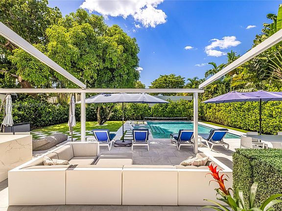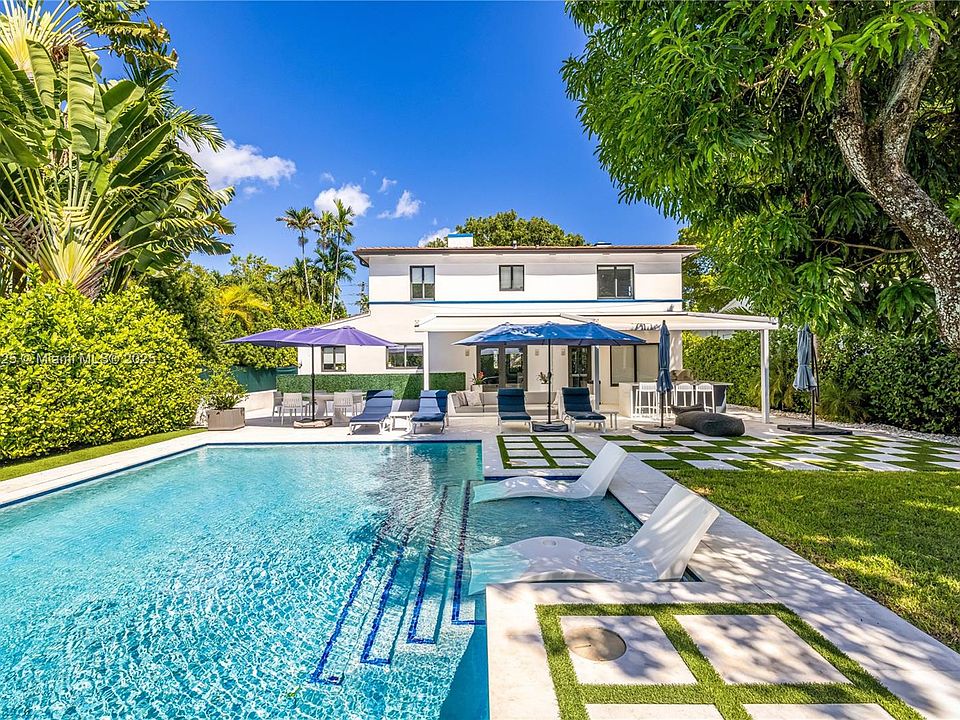 A private tropical retreat on prestigious Pine Tree Drive, this home offers an expansive backyard designed for seamless indoor-outdoor living. Enjoy a sun-drenched saltwater pool with cooling system, fully equipped outdoor kitchen with Dekton countertops, retractable pergola, marble pavers & lush, irrigated landscaping. Inside, the first floor features open & airy living & dining areas with porcelain tile floors, custom lighting, sleek kitchen with granite countertops, gas range & premium appliances. Upstairs, 3 spacious bedrooms & newly renovated bathrooms are finished with Kohler fixtures. Combining timeless charm with modern comfort, the home has been fully upgraded with a new roof, impact windows, updated electrical, gas water heater, EV charging station & insulated garage with new AC