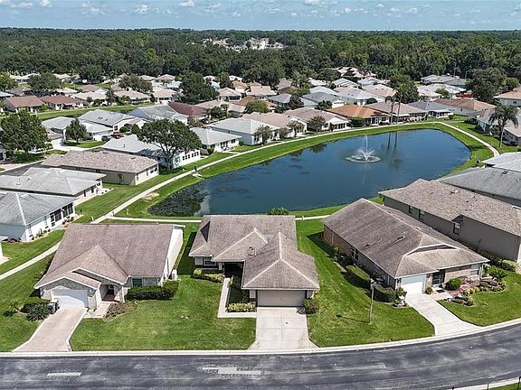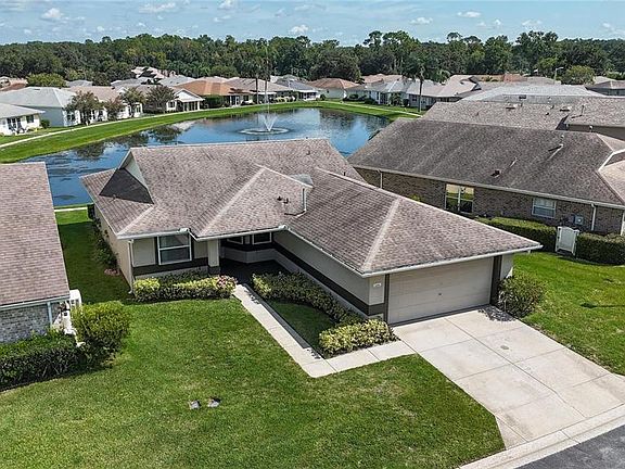 Price Reduction!! Charming 3 bedroom, 2 bath, 2 car garage home with 1,335 sq ft of living space in Silver Lakes, an active 55+ gated community. As you step inside you are greeted by the light-filled living room and dining room with vaulted ceilings and sliding glass doors that open to the screened lanai. The screened lanai is perfect for morning coffee, entertaining, or simply enjoying the Florida sunshine. The master bedroom offers serene lake and fountain views, private access to the screened lanai, a large walk-in closet, dual sinks, and a ceramic-tiled shower. Two guest bedrooms are located on the opposite side of the home, connected by a Jack and Jill bathroom with a tub and shower combo, and one of the guest suites features water views with direct access to the screened lanai. Newer luxury vinyl plank flooring flow throughout the main living areas with ceramic tile in the wet spaces—no carpeting in this home! Updates also include newer ceiling fans in every room and on the lanai, a new garbage disposal, updated kitchen and bathroom faucets and a new microwave. The spacious eat-in kitchen has plenty of cabinet and counter space, and an inside laundry room is conveniently located just off the kitchen with access to the garage. All the furniture is included in the sale, making this home truly move-in ready so you can start enjoying the Florida lifestyle from day one. Forget about yard work and pool maintenance—the low HOA fee of $225 a month includes cable, internet, lawn care, and reclaimed irrigation water. Instead, enjoy the resort-style amenities including a heated junior Olympic-sized swimming pool, hot tub surrounded by a beautiful paver patio, a clubhouse with fitness room, sauna, library, and kitchen, plus walking paths around three lakes. Silver Lakes is pet friendly, golf card friendly and conveniently located near shopping, restaurants, medical facilities, and I-4 for easy access to Tampa, Orlando, and Disney attractions. Experience carefree Florida living at its finest and call today to schedule your private showing.