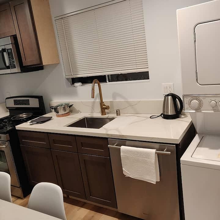 In the heart of LA on a cul-de-sac you discover a Lovely fresh Brand New construction Studio apartment. All bells and whistles. Laundry in unit Becomes available 4/9. This is an "ADU" - A legal freestanding backhouse. This private entrance back house boasts a Studio with their own private bath and full kitchen with en suite laundry. Terms are negotiable. Ample street parking with permit. Owner pays water trash and sewer