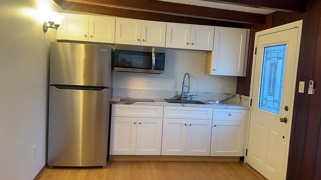 Beautiful remodeled JADU 1 bedroom, 1 bathroom home. Situated in a quiet neighborhood. Spacious kitchen with a refrigerator and microwave furnished. Washer and dryer hookups are available. Hardwood floors through the unit. You step outside to a green yard offering space play and relaxing. Centrally located shopping center and the freeway.
