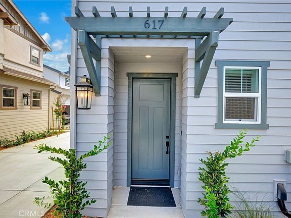 New 2025 Construction-Craftsman Style. Welcome to this beautifully designed Craftsman-style home, thoughtfully crafted with authentic three-color paint scheme and inviting covered front porches. Every detail reflects timeless architecture and modern comfort. 3 Bedrooms, 2.75 Bathrooms, Detached 2-Car Garage. Inside, the open floor plan offers exceptional functionality and elegant finishes throughout. The ground floor features a spacious bedroom and a three-quarter bathroom-ideal for guests or in-laws. Upstairs, the luxurious primary suite includes a walk-in closet with built-in organizers, a private commode room, dual sinks, and a large soaking tub/shower combo. The second upstairs bedroom is generously sized and served by a full bath, also featuring a soaking tub/shower. Stylish, Modern Finishes: White quartz countertops and white cabinetry throughout. Gold cabinetry fixtures and antique black Craftsman-style sink and shower hardware. Classic Frigidaire kitchen appliances: stainless steel range/oven and microwave hood combo with black accents, and a stainless steel refrigerator is included. Upstairs laundry room for added convenience. Living & Entertaining Spaces: Spacious living room with 9-foot ceilings, recessed lighting, and waterproof vinyl flooring. 8-foot paneled doors on the main level add to the open feel. Dining area flows seamlessly from the kitchen. Sliding glass door opens to a private concrete patio-perfect for entertaining and barbecues. Garage, Yard & Extras: Oversized detached 2-car garage with direct access to the secure backyard patio. Extensive landscaping with a variety of trees and plants. Backyard irrigation system included. Solar panels installed and included for energy efficiency. Gated pedestrian entry and electric rear vehicle gate provide privacy and security. Fire sprinklers throughout for added safety. This is a rare opportunity to own a well-appointed home in a thoughtfully planned and secure development. Move-in ready with all the features you need-and the finishes you want. 617 is identical to 619 except it is not staged and the pony wall in the living room has been removed, it is optional.