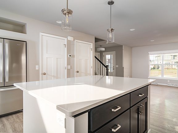 Image is representative of home; colors may vary.All prices, promotions and specifications are subject to change at any time without notice based on the discretion of Veridian Homes. Amenities: 14'x12' Patio with picture framing, Basement features 3/4 bath rough-in for future finished basement, Convenient main floor laundry, Cottage style twin home, with 3 bedrooms and 2 1/2 bathrooms, Custom Auburn Ridge(R) cabinetry, doors and trim throughout the home, Exterior features Mastic(R) siding in "Misty Shadow," Mastic(R) Board & Batten in "Quiet Willow" and Pella(R) Encompass Windows in White, Hallman Lindsay(R) "Place of Dust" paint with Orange Peel Texture, Kitchen features large island with a breakfast bar and HanStone(R) quartz countertops in "Tofino", Open Concept floor plan, Owner's suite features tray ceiling, walk-in closet, plus owner's bath, Shaker-style kitchen cabinetry in "Silhouette on Maple," includes hardware, crown moulding, soft close drawers/doors, and pull-out trash, Top plumbing brands used throughout the kitchen and bath, such as Kohler, Sterling and Moen, Trends(R) Monarch LVP flooring in "Summer Storm" throughout kitchen, foyer, powder room, laundry and great room