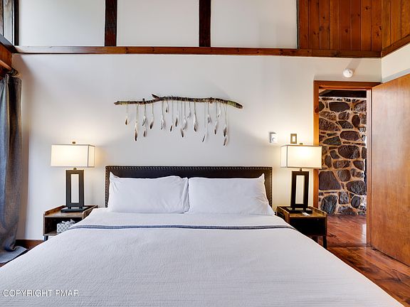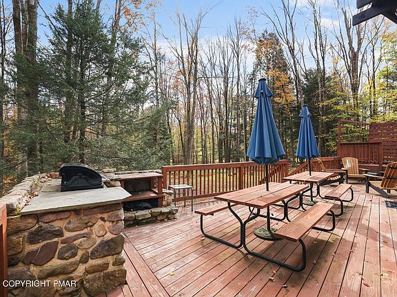Chalet Home with 3 bedrooms, 2 full baths has two fantastic fireplaces. One fireplace double-sided open to living room, dining room and other in the loft 3rd bedroom. Matching stone bar area off dining room. Kitchen and master bath have slate floors. Stainless steel appliances. All rooms in the home are large. Wood planking ceilings through out home. Front and back of house all windows. This is a true Pocono Chalet home that backs up to nature preserve. Nice fire-pit outside and an incredible wraparound porch with a nice size deck and built in BBQ. You can see all of nature with all the glass sliding doors. Currently an Airbnb.
