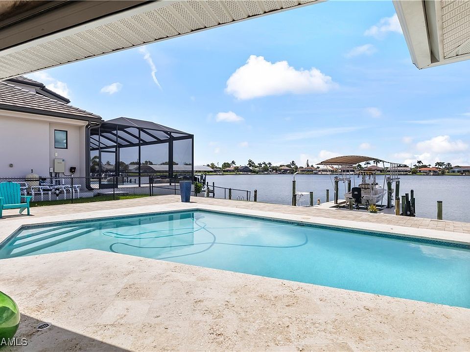 Live the ultimate Southwest Florida lifestyle with this Gulf-access lakefront pool home on Cape Coral’s highly sought-after 8 Lakes! A vacant lot here just sold for $610,000 — for only $15,000 more, this one comes with a house! TURNKEY and perfect for an Airbnb! Enjoy breathtaking water views, direct boating access to the Gulf, and a private dock with a 10,000-lb lift, upgraded 2” TanDeck decking, and reinforced 4” concrete davit area—perfect for serious boaters. Inside, this beautifully remodeled home features spacious bedrooms, modern finishes, and abundant natural light. The kitchen and laundry areas include granite surfaces and excellent storage. Additional upgrades include a newer roof, new pool pump, whole-house water softener with reverse osmosis, and resurfaced Turkish Stone pool deck. The fully fenced yard adds privacy for relaxing or entertaining by the water. Convenient to Cape Harbour, dining, and shopping—this home offers the best of Cape Coral living!
