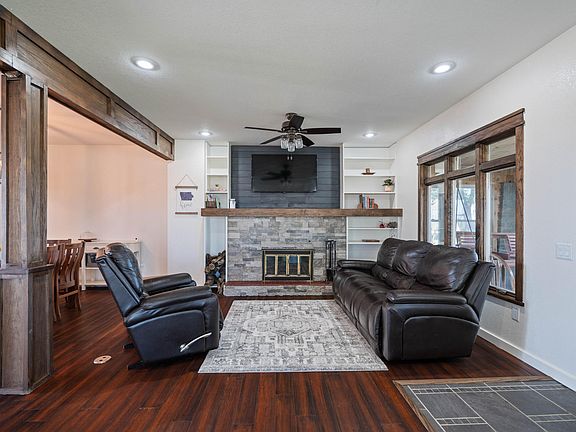 Inside, you are first welcomed by a charming enclosed porch—perfect for morning coffee or watching the seasons change. From there, step into the expansive open-concept living, dining, and kitchen area. The kitchen features stainless steel appliances that stay, a walk-in pantry, and a large island ideal for entertaining family and friends. A cozy wood-burning fireplace anchors the living room, creating the perfect gathering place on cooler evenings. A convenient office and half bath sit just off the main living area.
