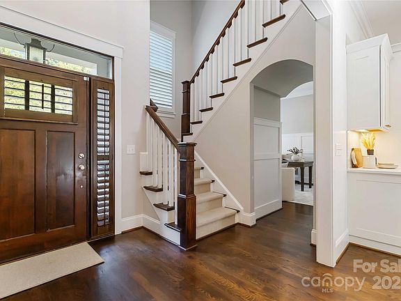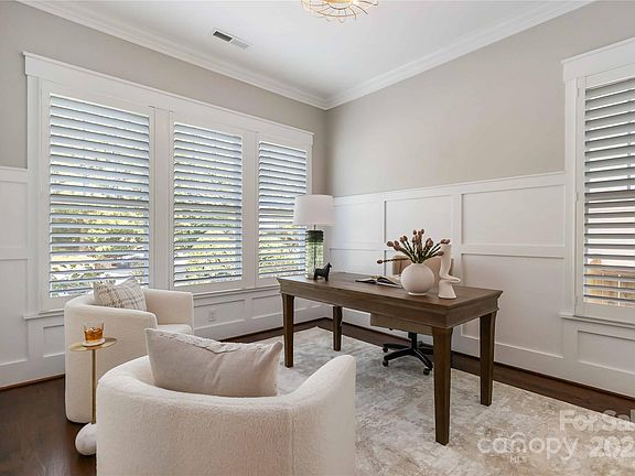 This stunning, newer construction, open-concept home blends timeless style with modern comfort. The gourmet kitchen is as elegant as it is functional, with an abundance of white cabinetry, Arctic White quartz countertops, a large island, stainless steel appliances, elegant satin brass faucet and upgraded light fixtures, plus double dishwashers. The gracious great room features a coffered ceiling, gas fireplace, and access to the deck and backyard. The formal dining room boasts gorgeous paneling. The main-level primary suite offers a tray ceiling, hardwood floors, his and hers walk-in closets, and a spa-like bathroom with marble floors, a freestanding soaking tub, and a separate shower. The main-level office features high wall paneling and provides a perfect work-from-home space. Upstairs includes a huge bedroom/bonus room with custom shelving, three additional bedrooms-two sharing a bath and one with a private en suite. Enjoy the convenience of having laundry rooms on both the main and upper levels. Gleaming hardwoods run throughout the entire home. Gorgeous blooming landscaping and an abundance of storage space round out this home. Ideally located minutes from SouthPark, with easy access to Uptown and Charlotte airport.