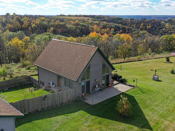 Escape to the bluffs with this stunning A-frame retreat overlooking the Mississippi River! Set on 16 private acres, this one-of-a-kind property blends rustic charm with endless potential. Soak in panoramic views from your living room, relax in the fenced yard, or tinker in the oversized 2-car garage. Inside, the open layout features 2 bedrooms and 1 bath, with an unfinished lower level already plumbed and ready for expansion?easily convert to 3?4 bedrooms and 2 baths. A rare opportunity to own a piece of Driftless paradise?peaceful, private, and full of promise. Minutes from boat landings, hunting, hiking, and everything the river has to offer!