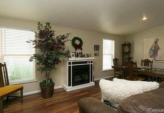 living room with a fireplace. This home also comes with all appliances (minus the microwave), solid surface counter tops,